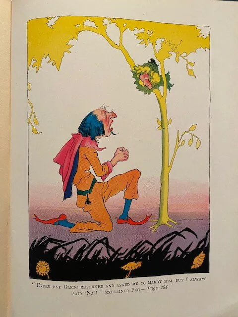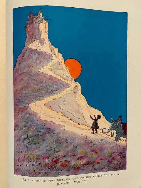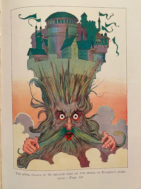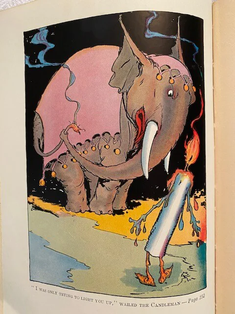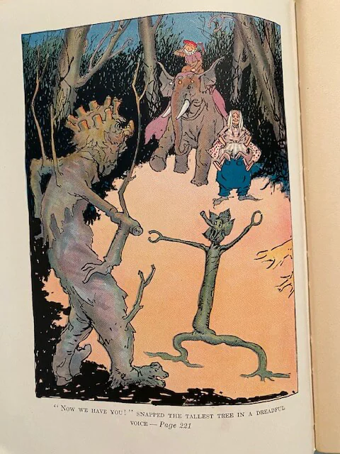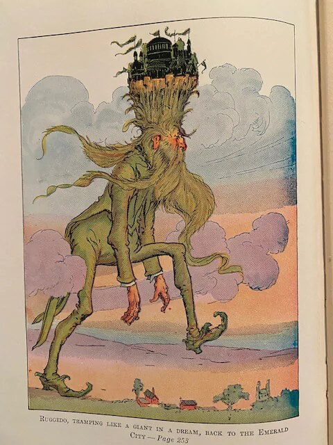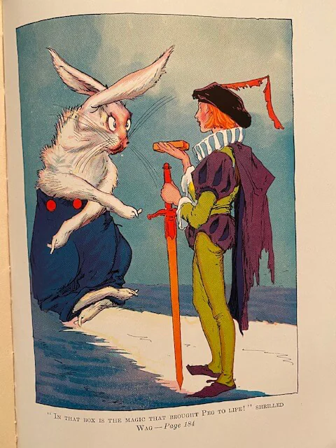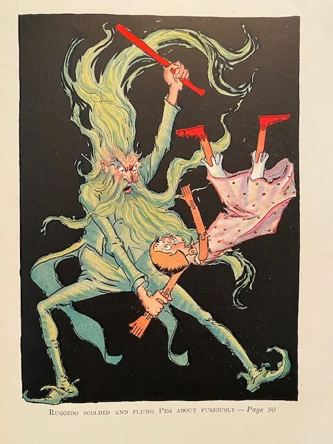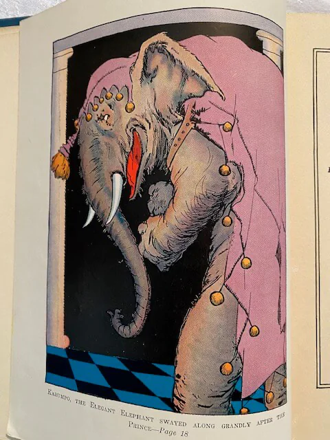 During Prince Pompadore of Pumperdink’s birthday celebration a magic scroll is found inside his birthday cake. It warns him that if he doesn’t wed a “proper princess” within seven days, his entire kingdom will disappear. The prince, along with the old, wise elephant Kabumpo, the Elegant Elephant, set off on an adventure to the Emerald City and along the way meet up with Peg Amy, a living wooden doll, and Wag, a giant rabbit. Meanwhile Ruggedo the Gnome King (Thompson “corrected” Baum’s “Nome”) turns himself into a giant while tunneling under the Emerald City, gets Ozma’s palace stuck on his crown, and runs off with it.