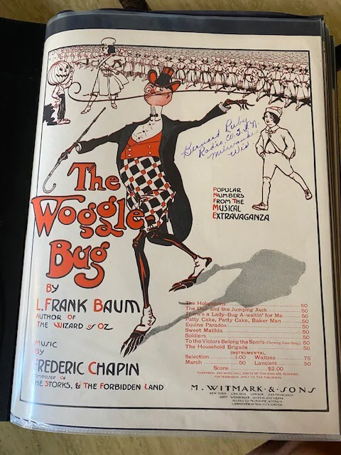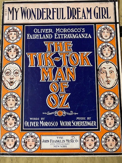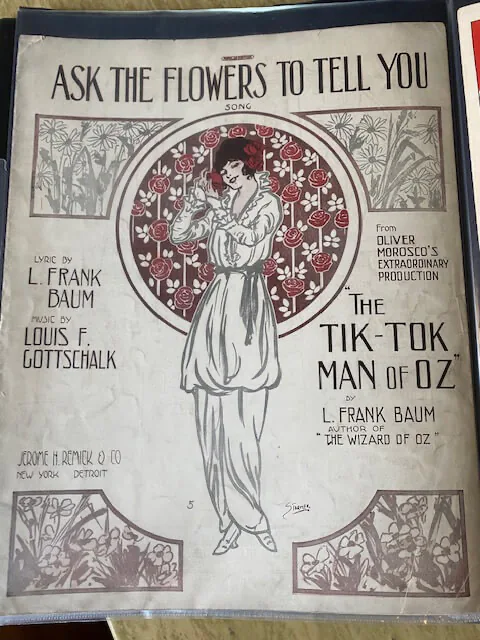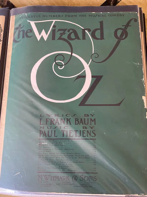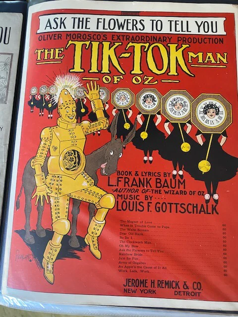 Most sheet museum on the display in the museum related to original 1902 broadway musical from 1902,TIk-tok man of Oz musical, Professor Woggle bug, etc. Before MGM’s release of The Wizard of Oz movie in 1939, Leo Feist issued sheet music for six of the songs from the movie. oF course JUdy Garland carrier involve performing all the way to late 1960s and we ahve a cabinet dedicated to her performances and dozens of sheet music accompnies her performances.