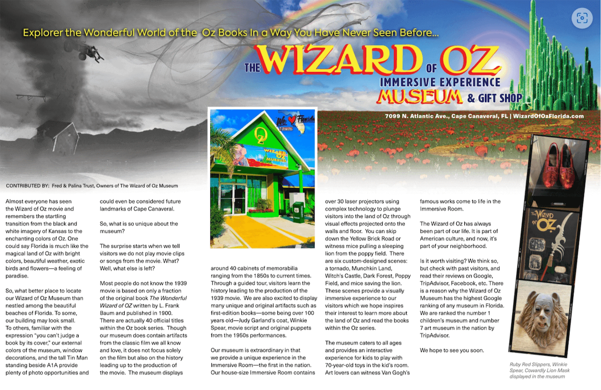 It’s fun to play tourists in our own community and discover gems in plain sight. Three heel clicks for the Wizard of Oz Museum, which offers an unexpectedly delightful experience that spans literature, film, pop culture, technology, and immersive experiences that can only be found here on the Space Coast.
